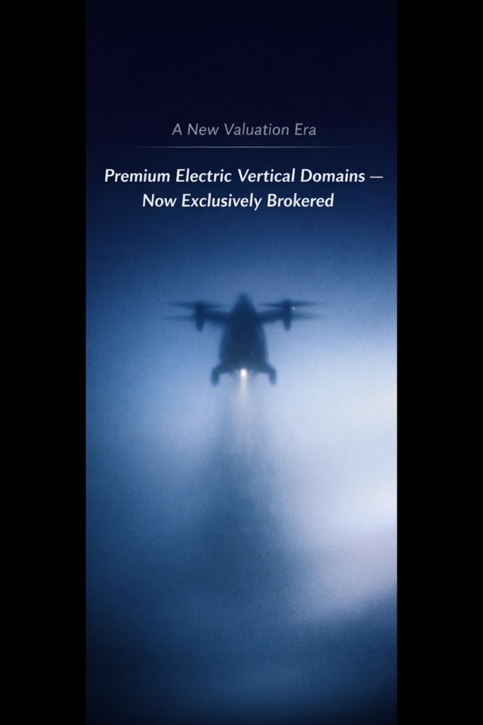 The Electric Vertical naming market has entered a higher valuation tier. Rising demand, increased inquiries, and industry‑wide price adjustments have elevated premium Electric Vertical domains into a new class of exclusivity. Accordingly, select assets — including FlyingEV.com, SaudiEV.com, EVArabia.com, EVA.taxi, FlyingEVtaxi.com, and ZePlane.com — are now held under private, elite‑broker representation only. BIN pricing is disclosed solely during qualified negotiations
